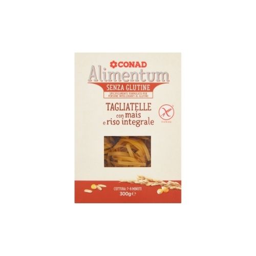 Tojás nélküli száraztészta. Nettó Tömeg: 300g. Összetevők: kukoricaliszt 50%, rizsliszt 49,2% (barna rizsliszt 37,2%, fehér rizsliszt), emulgeálószerek: zsírsavak mono- és digliceridjei. Átlagos tápérték 100g termékben: Energia: 1510kJ/ 356kcal, zsírok: 2,3g, amelyből telített zsírsavak: 0,8g. Szénhidrát: 76,0g, amelyből cukrok: 0,5g. rost: 2,2g, Fehérje: 6,8g, só: 0,01g. Száraz hűvös helyen tárolandó. Minőségét megőrzi (nap/hó/év)lásd a csomagoláson.